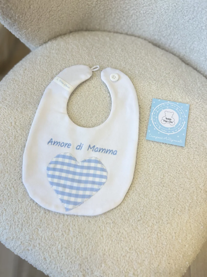Morbidi bavaglini per neonati realizzati interamente a mano con dettaglio a forma di cuore e scritta ricamata. Offrono una copertura ottimale intorno al collo del bambino. Due strati di tessuto per assorbire l’umiditร .