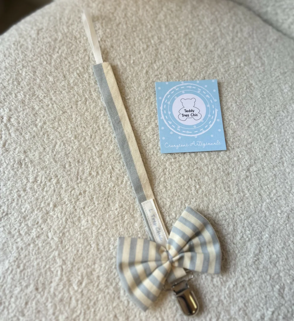 Le nostre catenelle portaciuccio sono realizzate interamente a mano in morbido tessuto di cotone, hanno da un lato la parte dove si inserisce il ciuccio a cappiola e dall’ altro lato c’รจ una clip per attaccare il portaciuccio.
