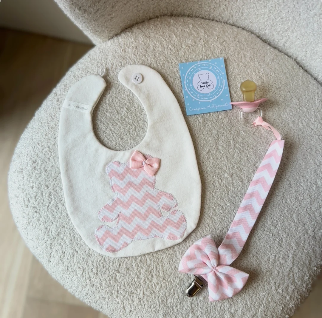 Bellissimo coordinato bavetta con portaciuccio tutto realizzato a mano.