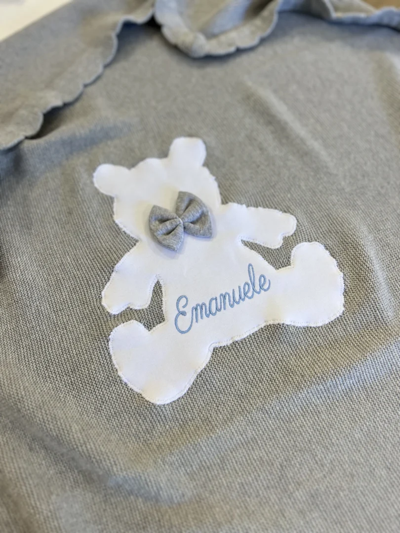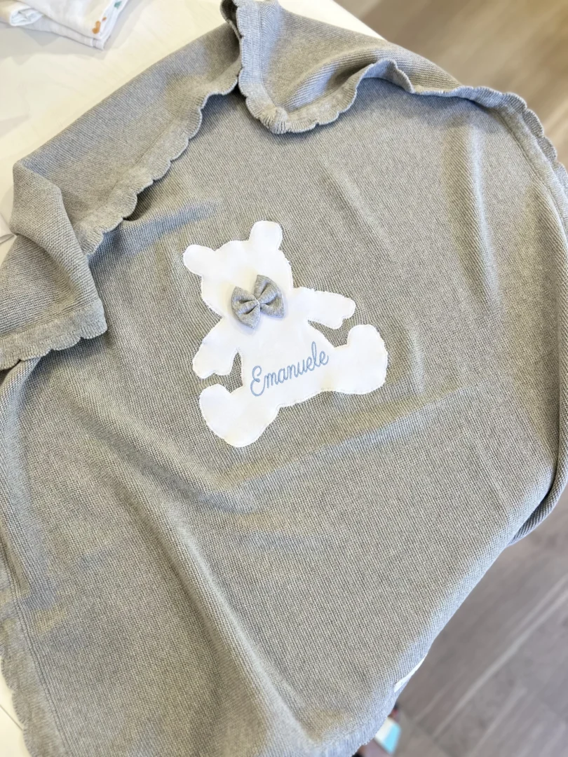 Copertina in morbido filo di cotone. La copertina puรฒ essere usata per prendere il bambino in braccio, sulla carrozzina o sul passeggino. Al centro della copertina c’รจ il dettaglio con un tenero orsetto tinta unita di colore bianco con un fiocchetto grigio.