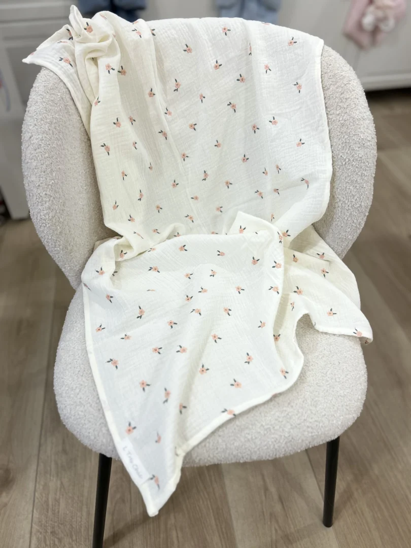 Copertina in mussola di cotone panna con fiori ricamati. Ideale da usare sul passeggino, per prendere il bambino in braccio o per il bagnetto.