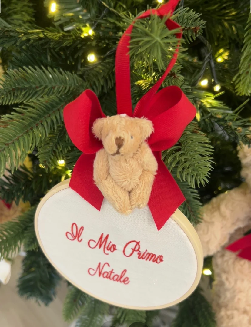 Quest’ anno un Natale ancora piรน speciale, il suo primo Natale insieme a voi; per ricordarlo sempre ogni volta che guarderai l’ albero di Natale abbiamo realizzato il nostro telaio con scritta ricamata il mio primo Natale con fiocco e un tenero orsetto, ideale come decorazione per l’ albero di Natale o per decorare la casa.